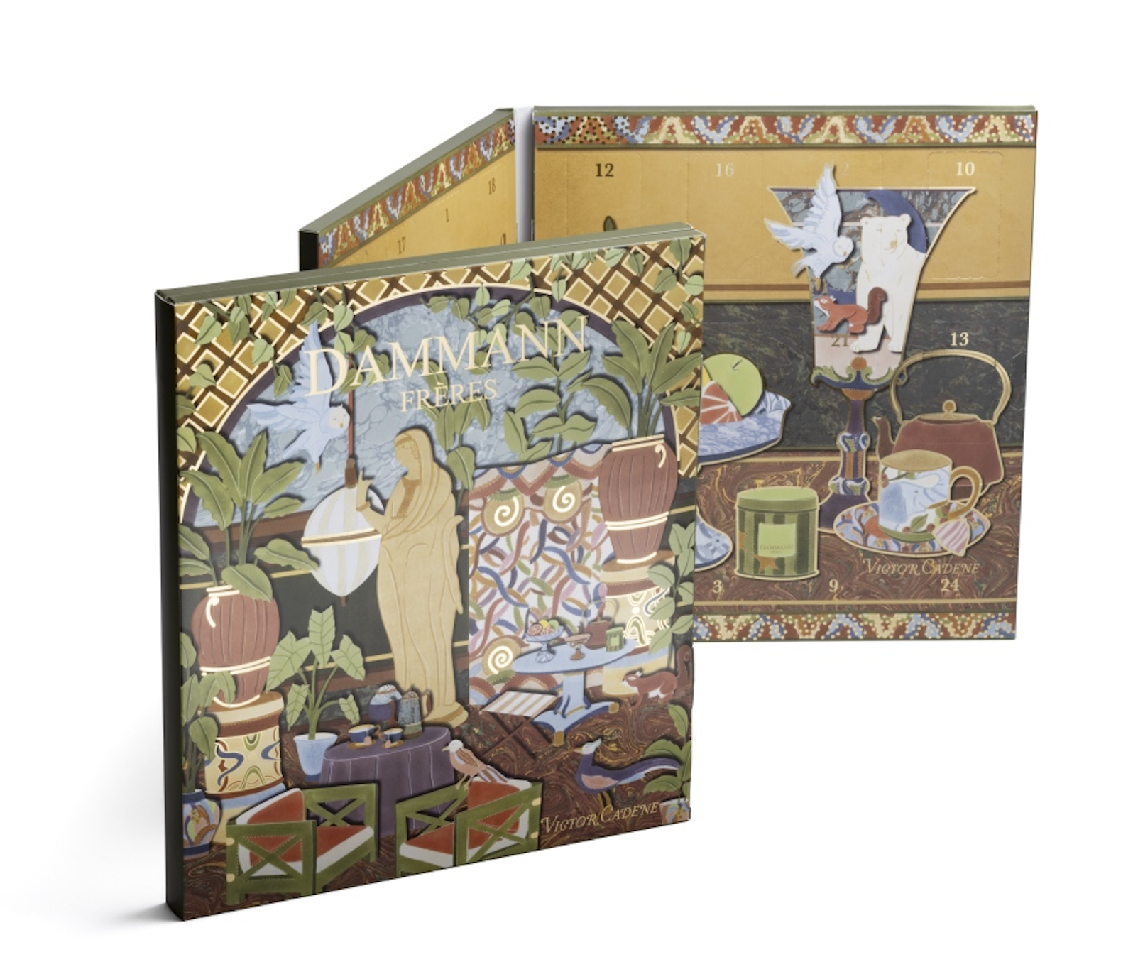 Advendikalender, mille kujunduse on loonud kunstnik Victor Cadene, kutsub meid nautima advendiaega gurmeeteemaliste pärastlõunatega, mille juurde kuulub valik teesid ja taimseid infusioone. Kalender sisaldab 24 individuaalselt pakendatud Cristal® teekotikest, mis esindavad 24 erinevat maitsestatud retsepti või päritoluteed. Nende hulgas on Dammann Frères´i olulised jõulusegud ning ka uued peened ja leidlikud loomingud.