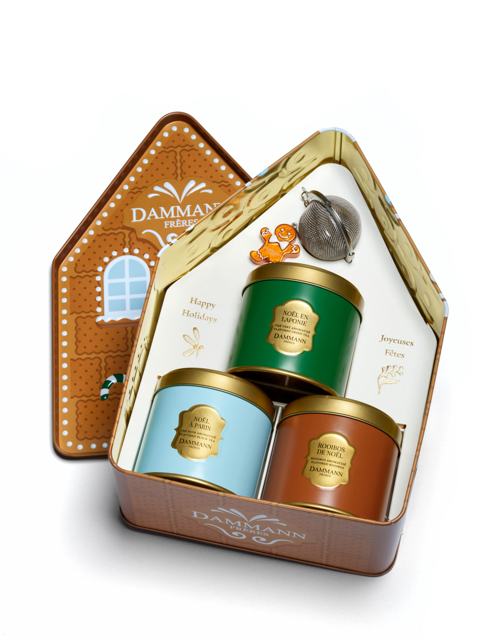 See kaunilt kujundatud metallkarp, millel on armas piparkoogimaja kujundus, toob kokku kolm jõuludele omast maitseelamust. Karp sisaldab kolme 40 g purki – kahte teed ja üht pidulikku taimeteed – ning lisaks ka elegantset teesõela. Boonusena saab karpi hiljem kasutada küpsisepurgina, milles serveerida ja hoida maitsvaid omatehtud jõuluküpsetisi.