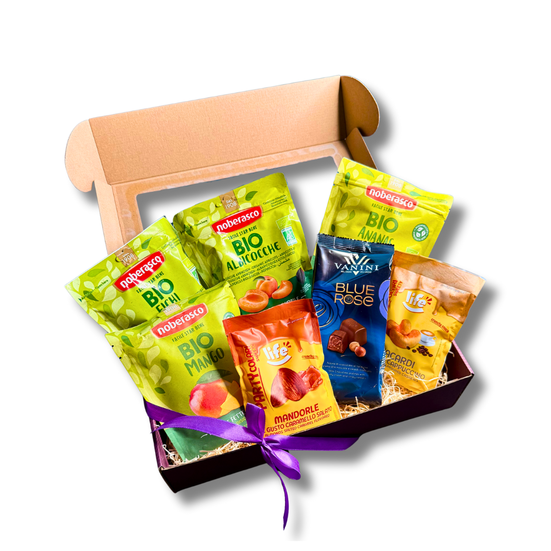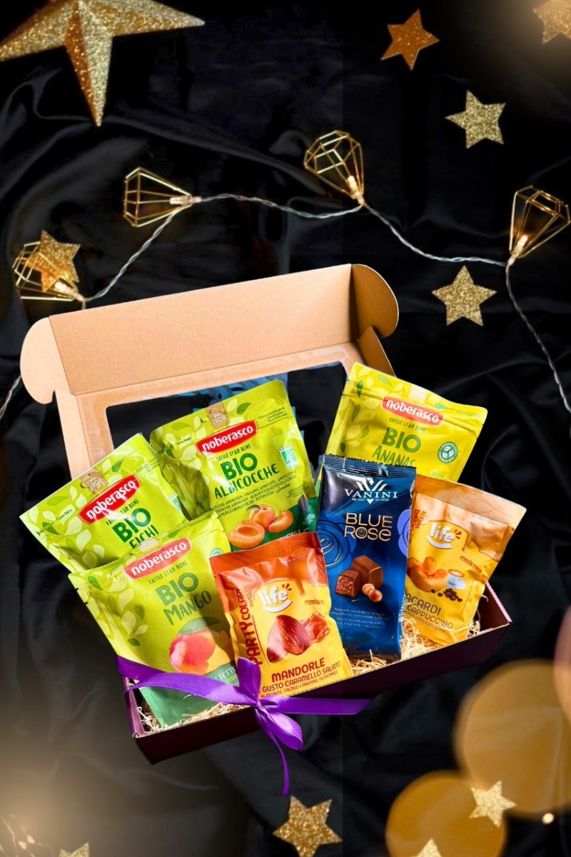 Kinkekomplekt “Maiustamise maailmameistrile” sobib kinkimiseks igaühele, kes armastavad üllatavaid maitsekooslusi- põnevalt maitsestatud pähkleid, mõnusaid kuivatatud puuviljasid ja suussulavaid šokolaadipralineesid.
