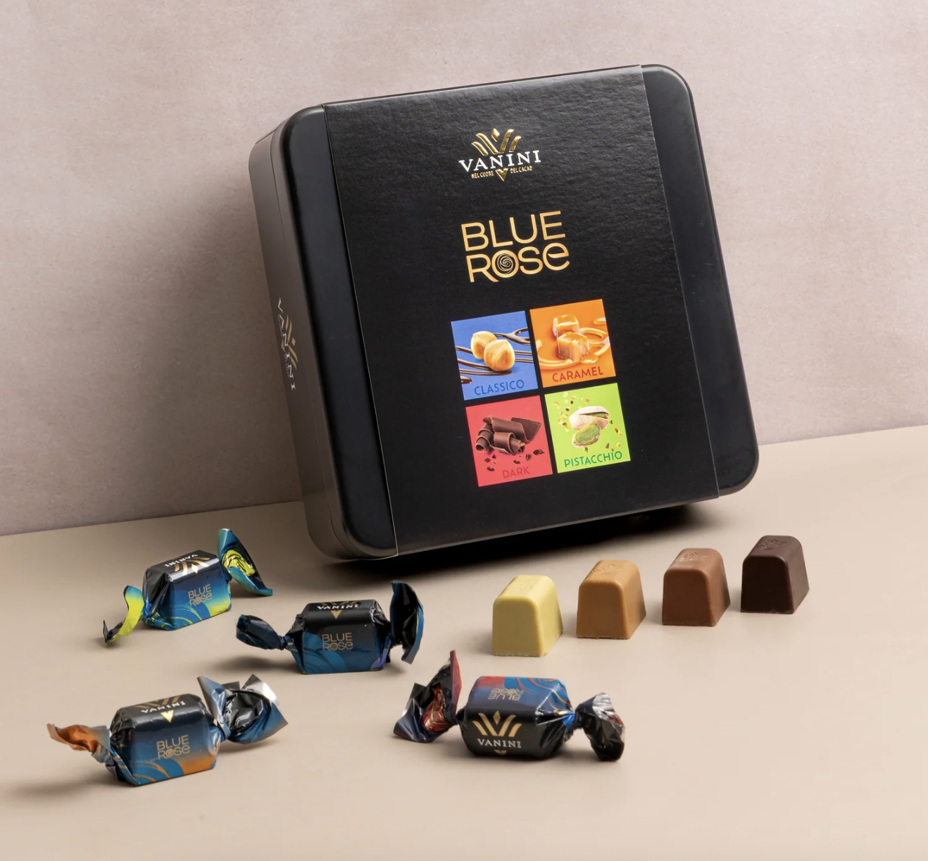 Elegantne ruudukujuline plekkkarp, mis on kaunistatud Vanini signatuurvärvidest inspireeritud kuldsete detailidega. See peen pakend sisaldab kogu Blue Rose pralineekollektsiooni, muutes selle ideaalseks kingituseks igaks sündmuseks. Erinevad piima-, tumedad, karamelli- ja pistaatsiapralineed sarapuupähklikreemi ja krõmpsuvate helvestega.
