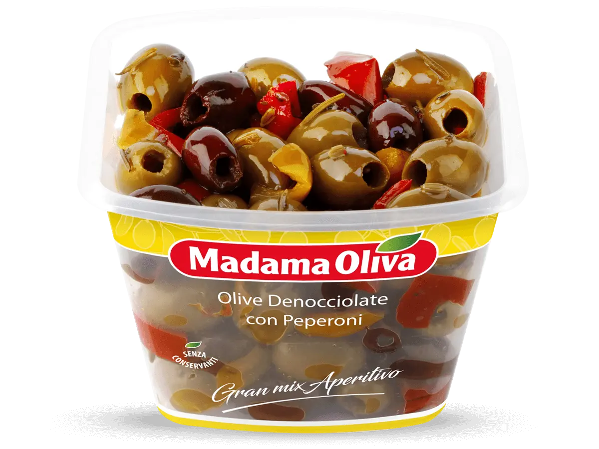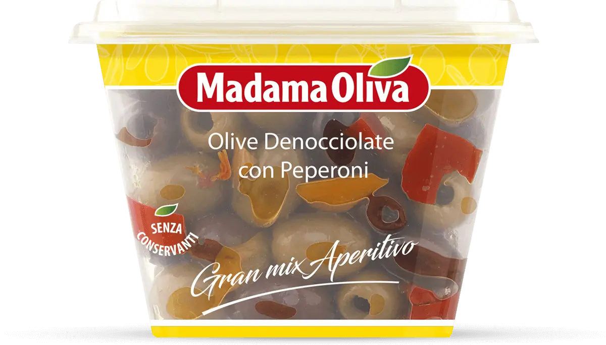 Madama Oliva “Country” stiilis oliivid on suured, mahlased ja kivita rohelised oliivid, mida on maitsestatud paprika, küüslaugu ja hoolikalt valitud vürtsidega. Tulemuseks on intensiivne ja kodune maitse, mis toob lauale Vahemere köögi parimad nüansid.
