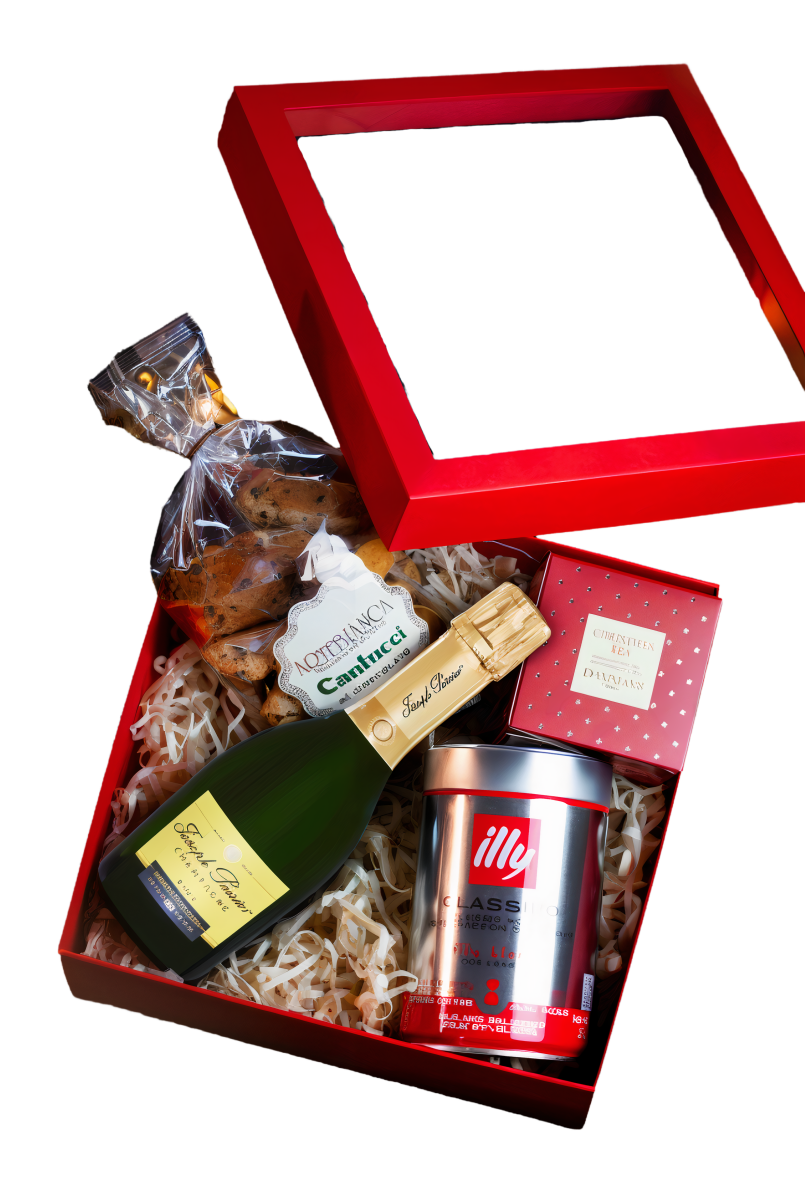 Punasesse kinkepakki on kokku pandud aromaatne Dammann jõulutee, rikkalik Illy kohv, klassikalised Cantucci küpsised ning ekslussiivne Joseph Perrier šampanja Cuvèe Royale Brut 37,5cl – täiuslik kooslus, mis loob hetki, mida nautida aeglaselt ja stiilselt.